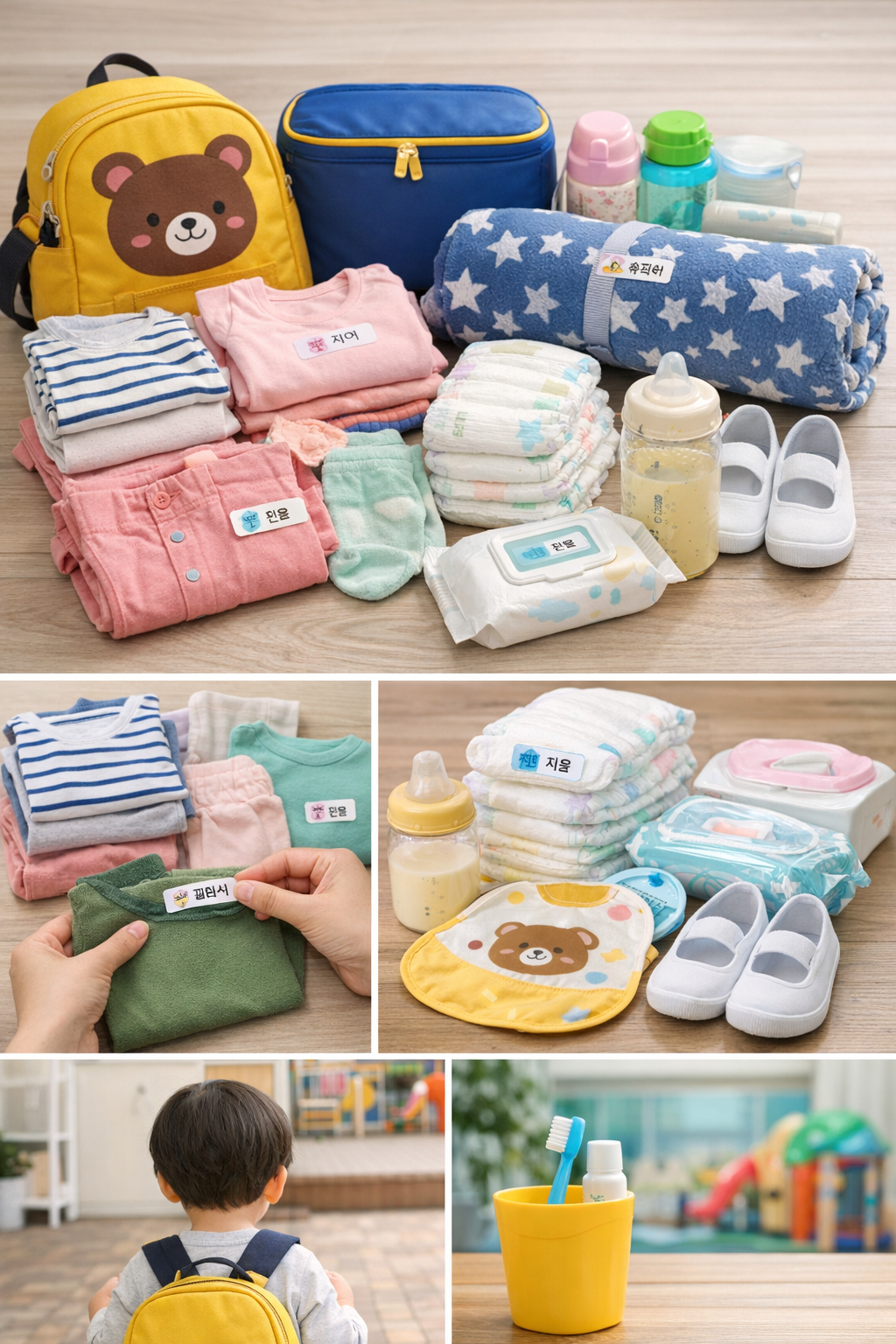 모든 준비물에는 반드시 아이 이름을 기재해야 합니다. 옷, 기저귀, 물티슈, 이불 가방까지 빠짐없이 표시하세요.